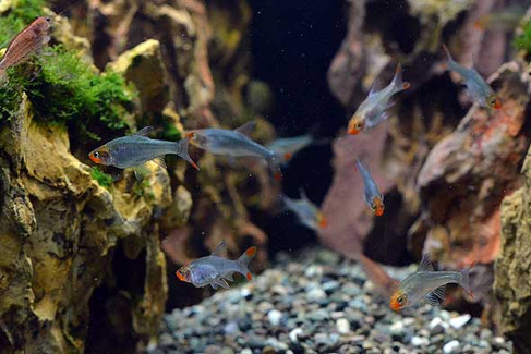 頭と尾鰭の先が赤く染まるコイ科の熱帯魚。